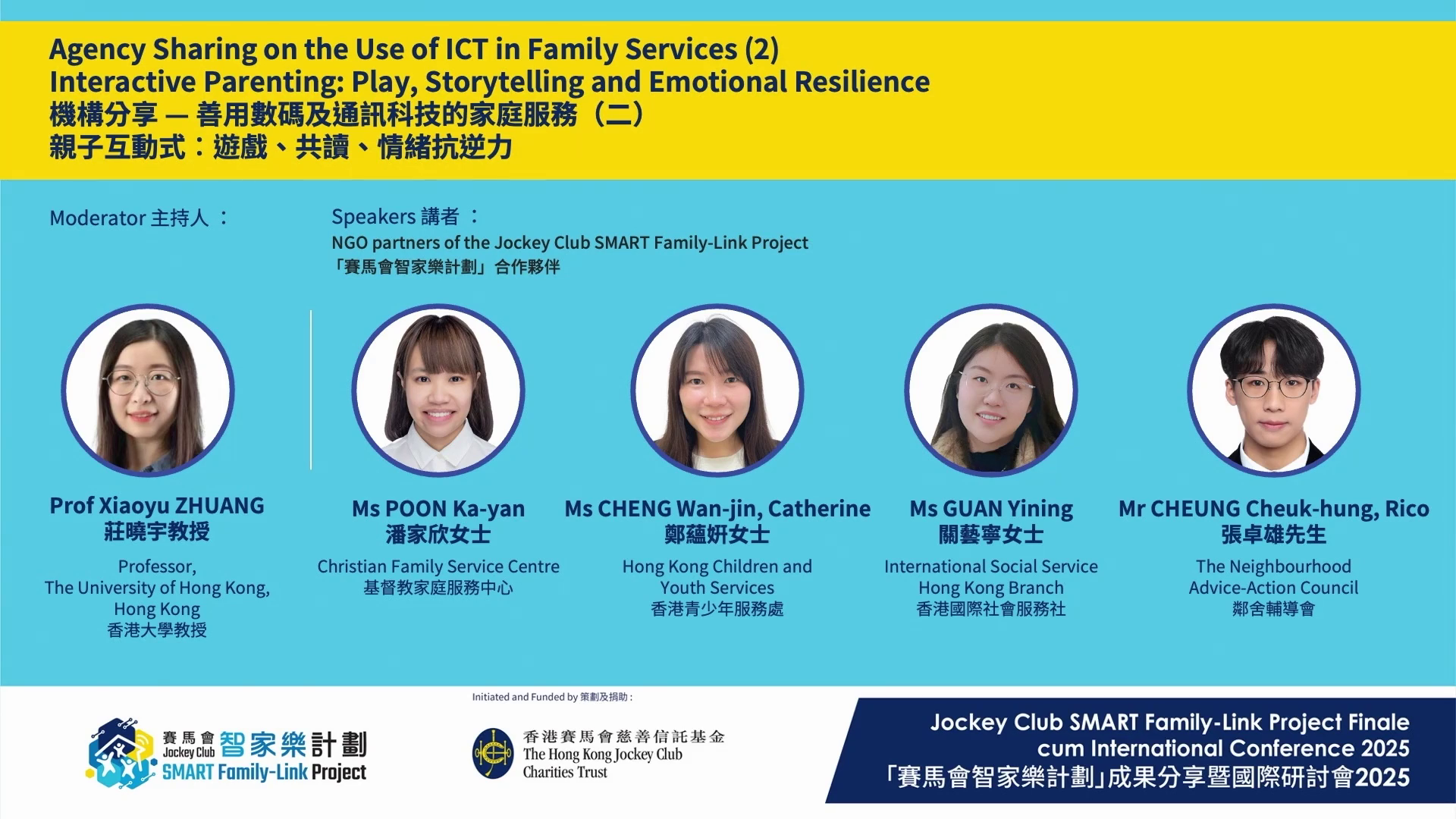 題目︰ 機構分享 — 善用數碼及通訊科技的家庭服務 (三):共建幸福家庭︰揉合科技與傳統 講者︰ 「賽馬會智家樂計劃」合作夥伴 香港明愛家庭服務高級督導主任張慧玲女士 香港基督教服務處註冊社工洪雪盈女士 香港公教婚姻輔導會註冊社工梁翠婷女士 東華三院註冊社工麥靜筠女士 主持︰ 香港浸會大學社會工作系講座教授及「賽馬會智家樂計劃」項目首席調查研究員黃富強教授 簡報: 香港明愛家庭服務 香港基督教服務處 香港公教婚姻輔導會 東華三院 聲明︰...